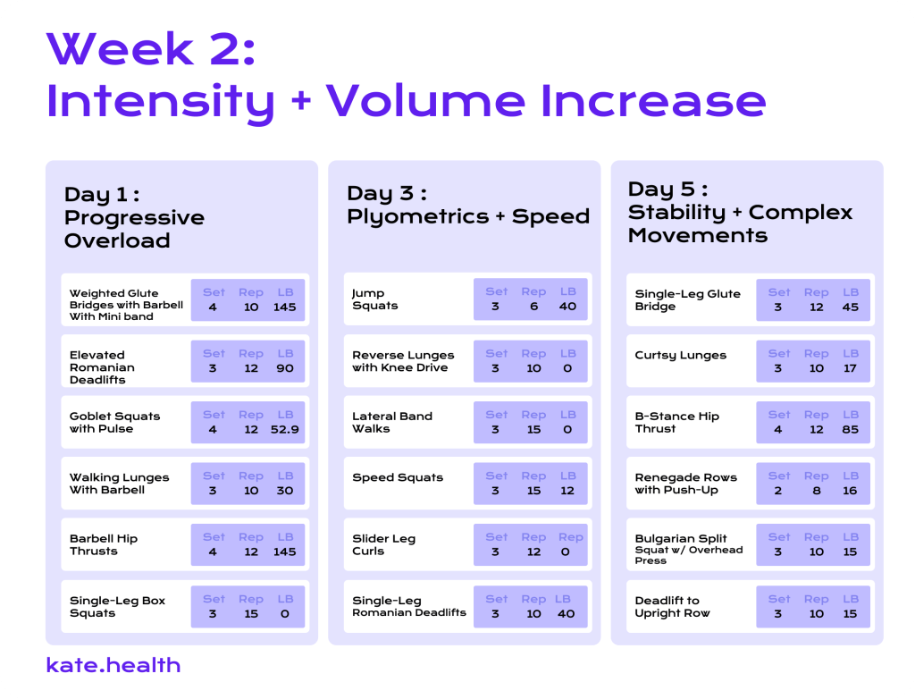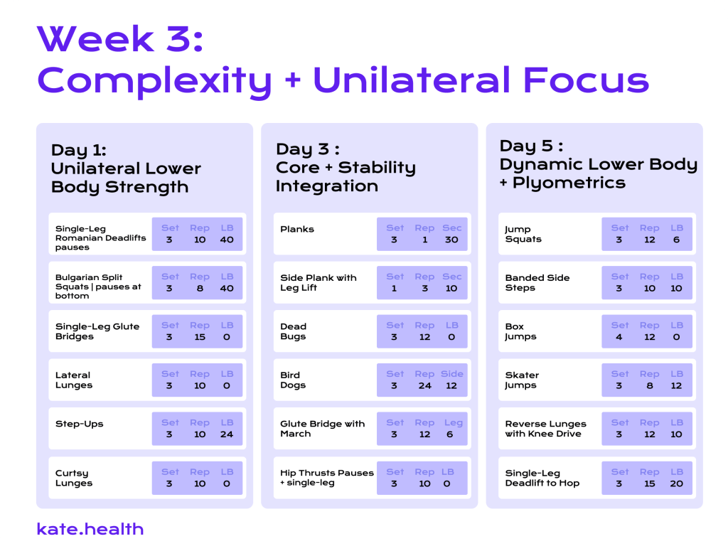 Week 3: Complexity and Unilateral Focus (or Increased Intensity and Complexity) Purpose: Introduces more complex and unilateral exercises, increasing the challenge and targeting muscle imbalances. Contribution to Hypertrophy: Complexity and unilateral exercises ensure that both sides of the body are equally worked, addressing weaker areas and promoting balanced muscle growth. The variety also helps stimulate muscle growth by challenging the muscles in new ways.