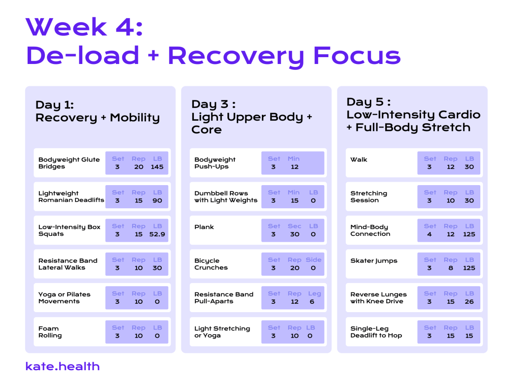 Week 4: De-load and Recovery Focus Purpose: Reduces workout intensity and volume, focusing on recovery. Contribution to Hypertrophy: Recovery is a critical component of muscle growth. This week allows my muscles to repair and grow stronger in response to the previous weeks’ stimuli. Deloading helps prevent overtraining and ensures that I can continue making progress in subsequent training cycles.